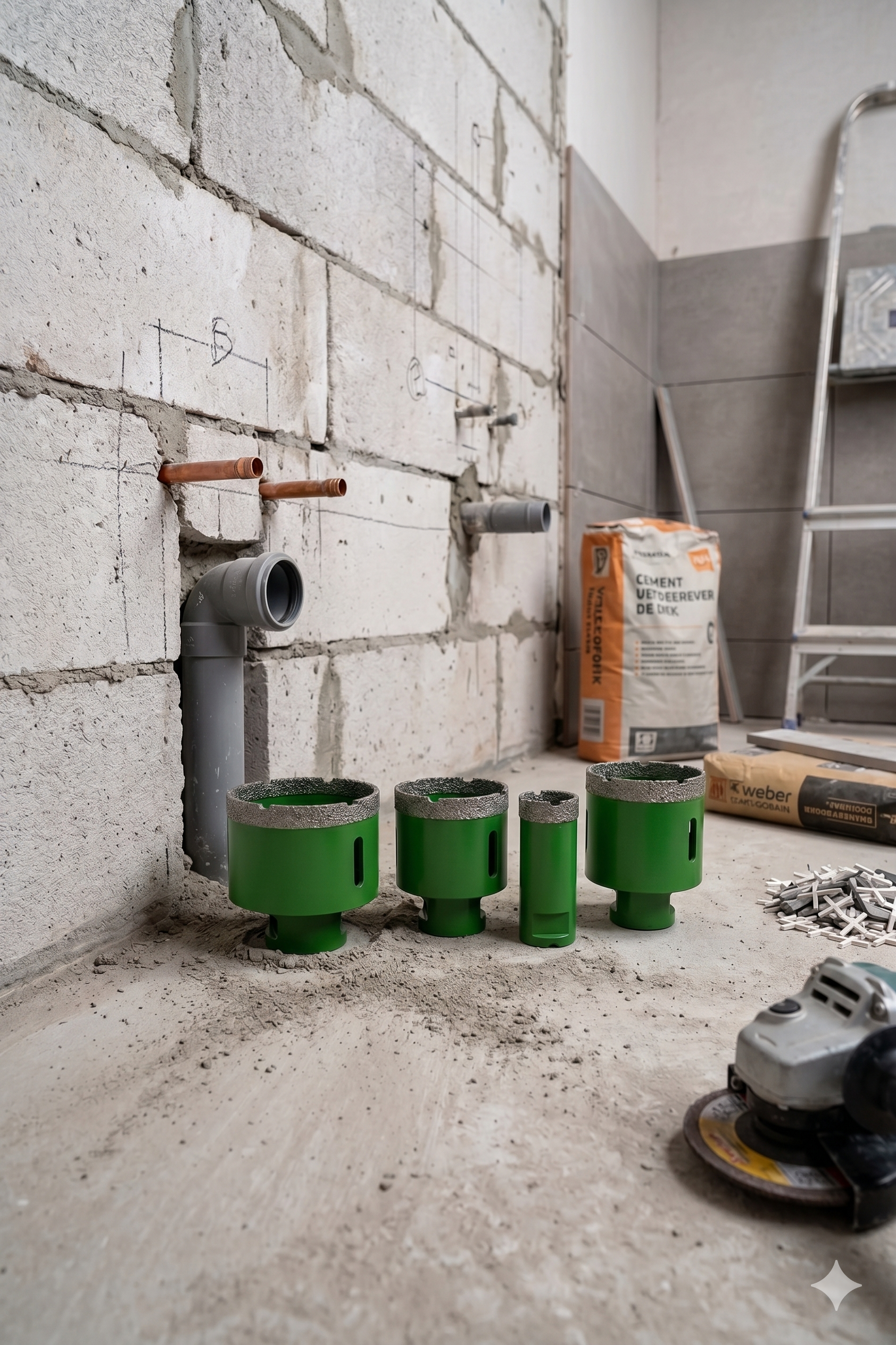 - Maakgaten voor kranen, stopcontacten en leidingwerk in betegelde wanden